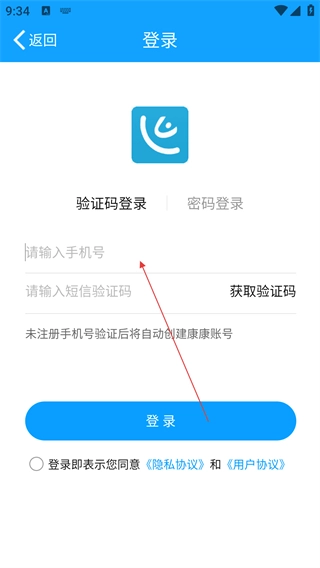 1、在登录页面输入手机号,获取并填写验证码后,点击【登录】按钮即可进入应用主界面。