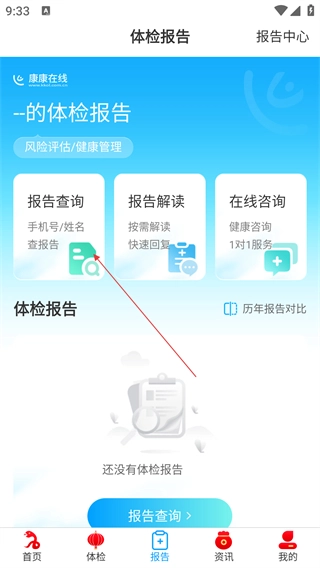 3、进入体检报告页面后,点击【报告查询】选项,即可跳转至报告查询的信息填写界面。