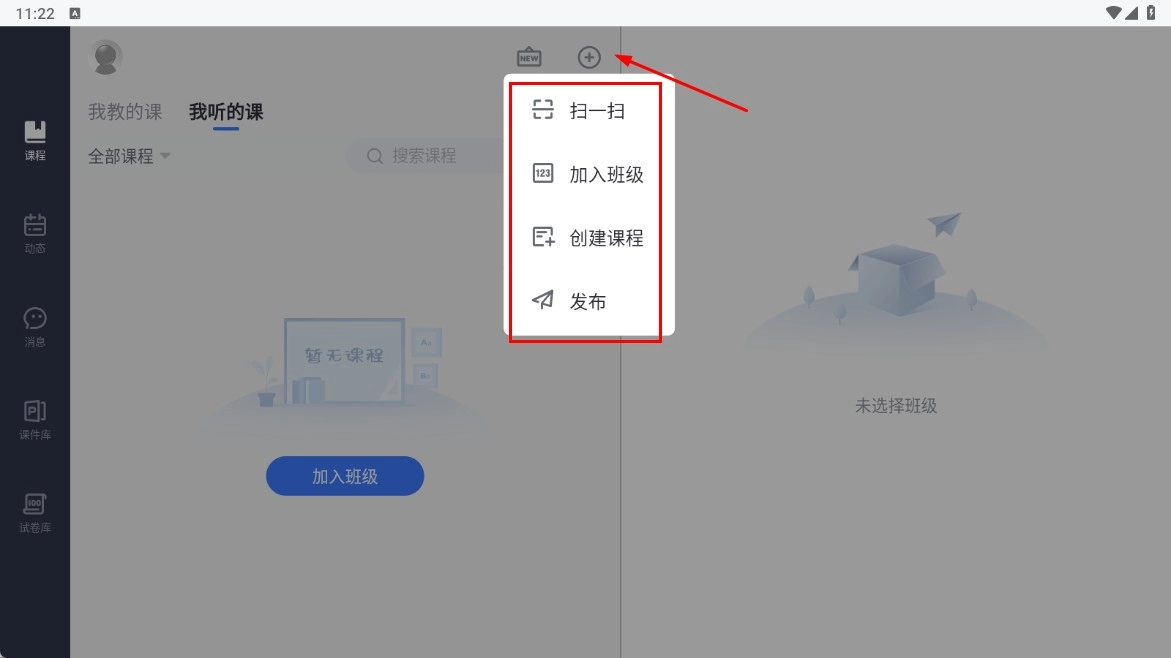 4、点击页面顶部的加号按钮,就能选择【扫一扫】【加入班级】【创建课程】【发布】等功能来开展操作。