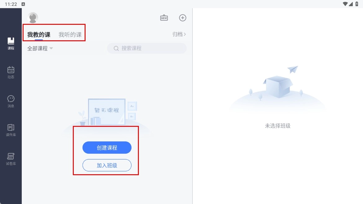 1、在课程页面,能够切换【我教的课】和【我听的课】这两个标签,也可以点击【创建课程】或者【加入班级】按钮来开展相应操作。