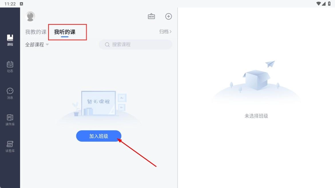 2、切换至【我听的课】标签页后,点击【加入班级】按钮,即可进入加入班级的操作流程。