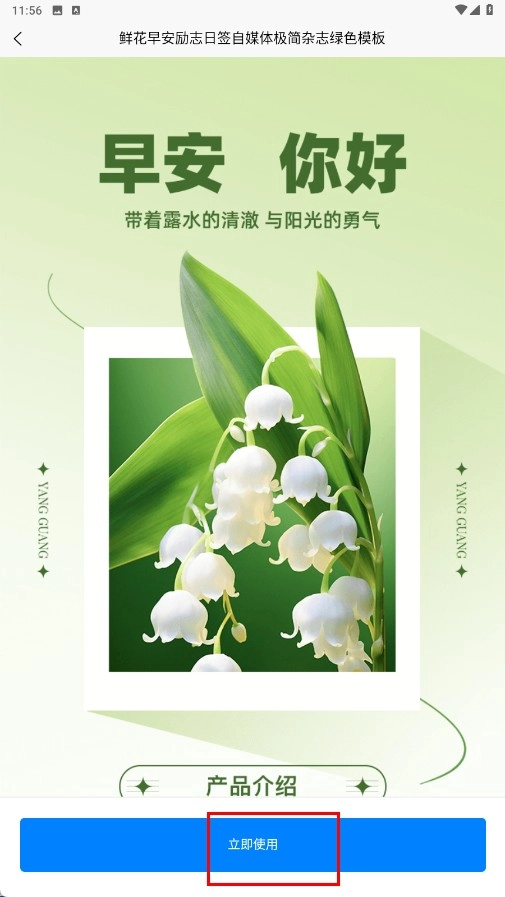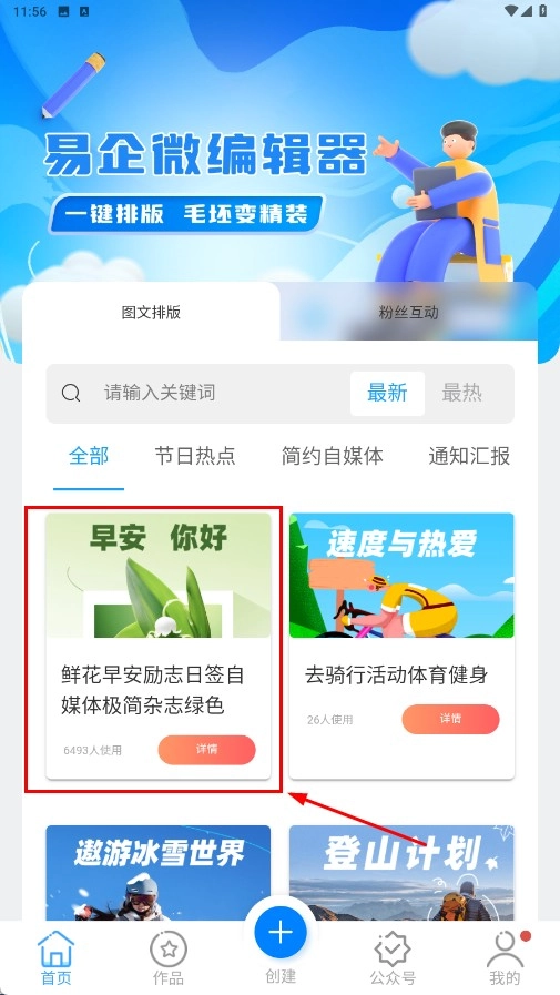 1、在易企微编辑器的首页,找到并点击【鲜花早安励志日签自媒体极简杂志绿色模板】对应的模板卡片。