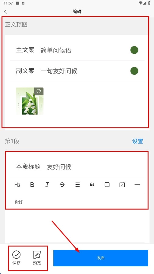 4、在编辑页面完成正文顶图、段落标题等内容的设置后,可以点击【保存】【预览】或者【发布】功能按钮。