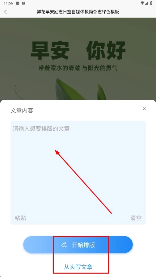 3、在文章内容输入框中,输入或者粘贴需要进行排版的文章,然后选择【开始排版】或者【从头写文章】选项。