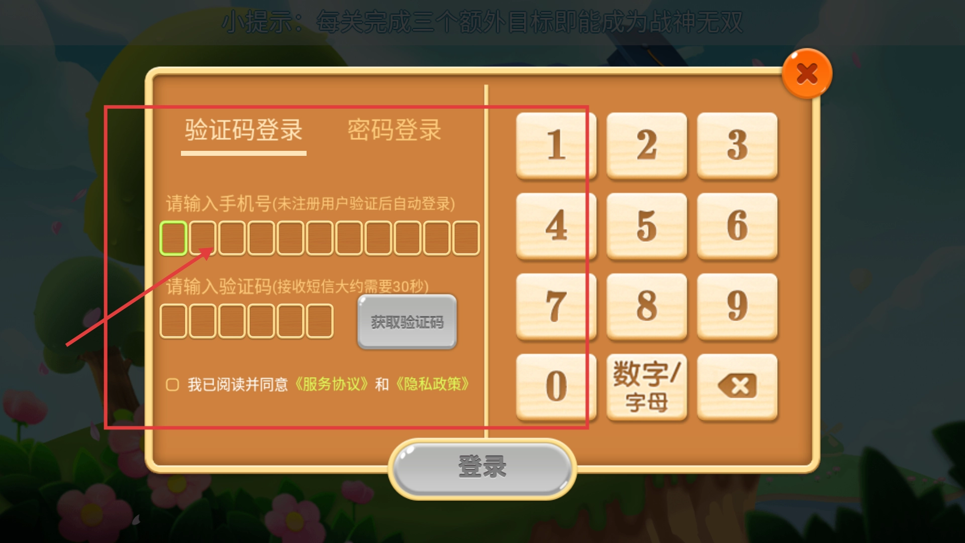 在登录界面,选择验证码登录的方式,接着依次填写手机号与验证码,再勾选同意相关协议,就能完成登录操作了。