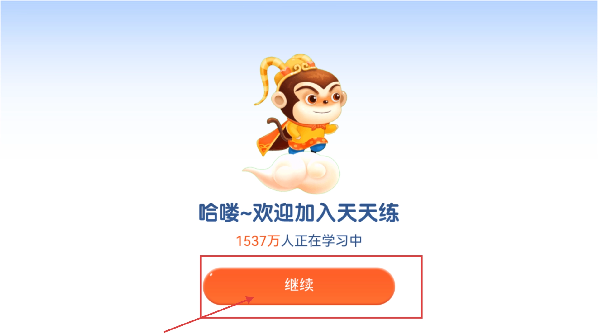 2、登录完成后,会出现“欢迎加入天天练”的界面,点击界面上的【继续】按钮,就能进入主界面。