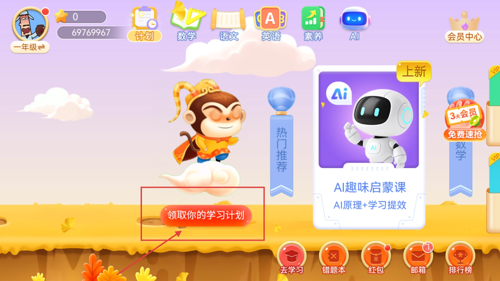 3、在主界面,点击【领取你的学习计划】按钮,能够开启个人学习计划的定制流程。