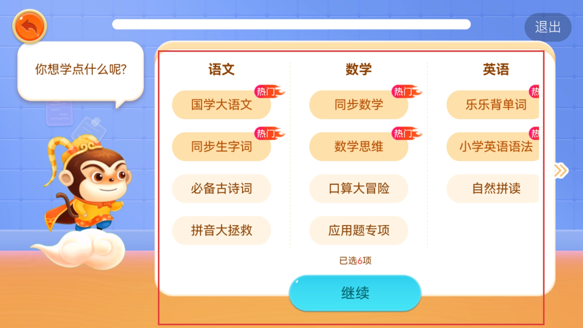 4、在学习内容选择界面,你可以从语文、数学、英语等学科里挑选自己感兴趣的学习模块,选好之后点击【继续】按钮,就能开启学习之旅了。