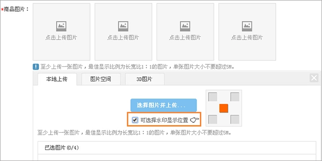 在发布产品时,需要先勾选相关选项,再上传图片,这样才能呈现水印效果。水印的位置支持选择,具体有居中、左上角、左下角、右上角、右下角这五种位置可选。举例来说,如果选择居中位置,那么商铺二级域名的水印就会显示在图片的中间区域。