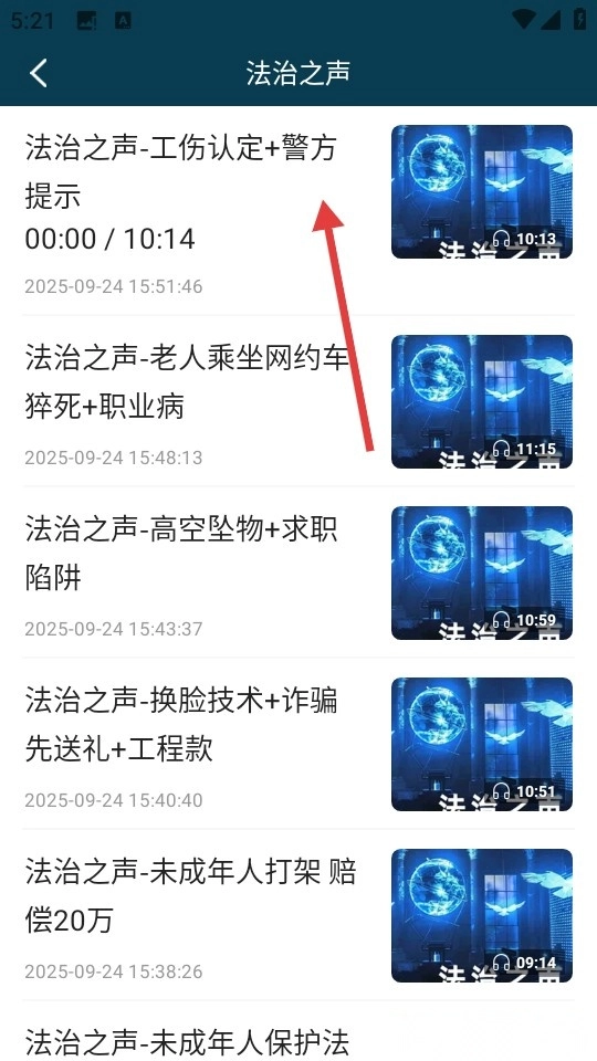 3、在节目列表页面,点击“法治之声-工伤认定+警方提示”这一节目条目,即可进入播放界面。