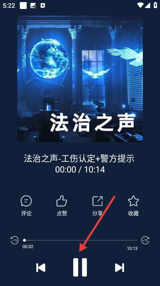 在播放界面中,你可以点击暂停按钮来控制音频的播放状态,同时也能开展评论、点赞、分享、收藏之类的操作。