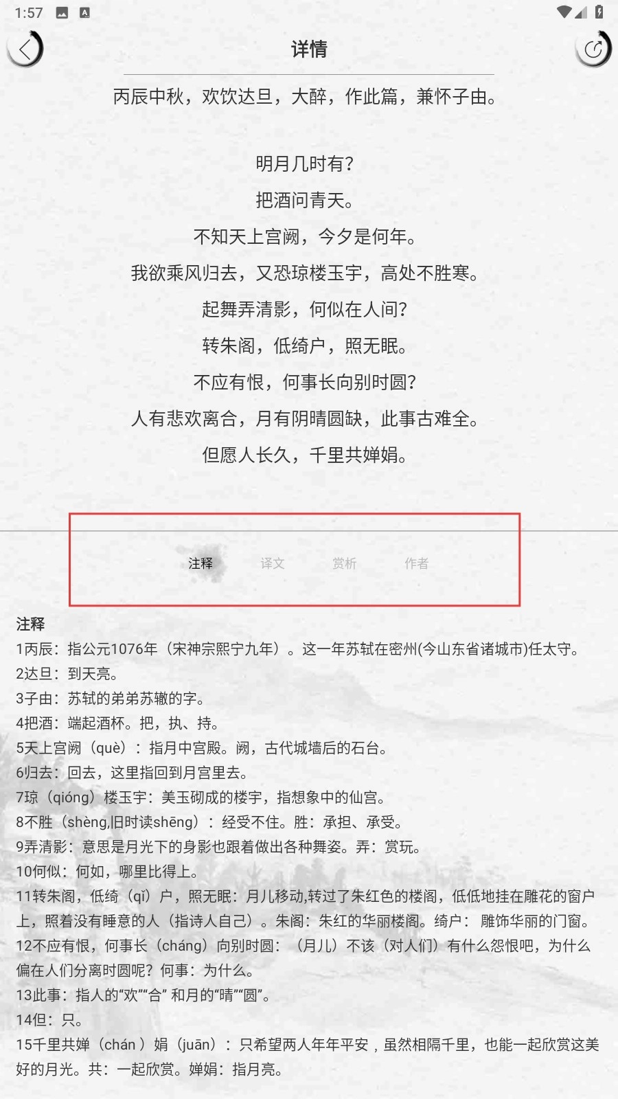 2、详情页支持切换【注释】【译文】【赏析】【作者】板块,便于了解诗词相关信息。