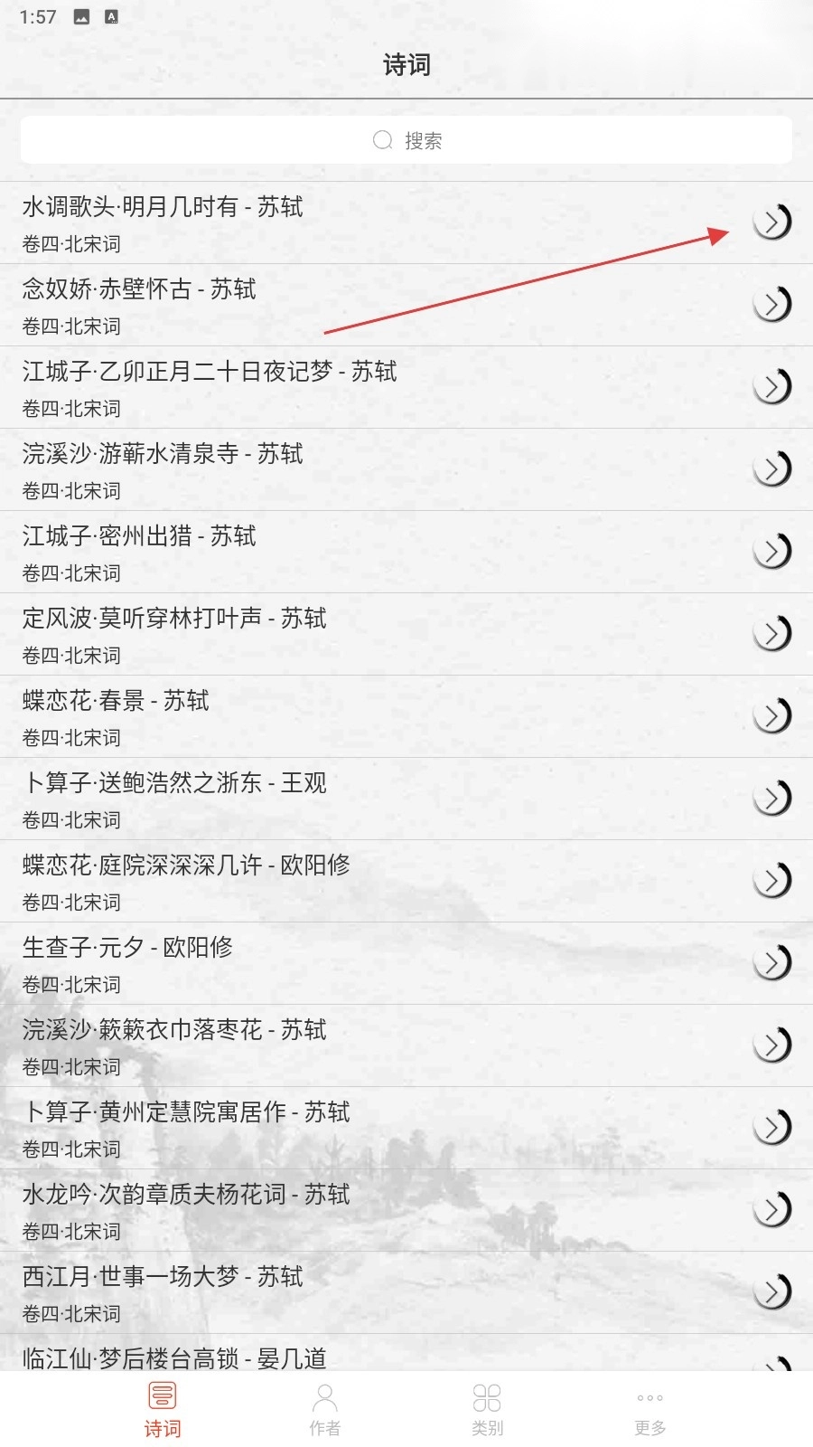 1、在“诗词”列表页面,点击诗词右侧的按钮,即可进入详情页面查看具体内容。
