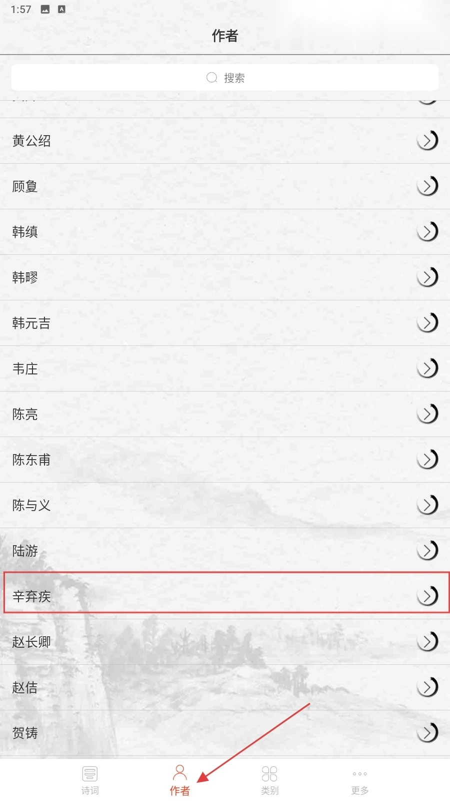3、点击底部的【作者】选项,进入作者列表页面,即可查看相应作者的诗词作品。