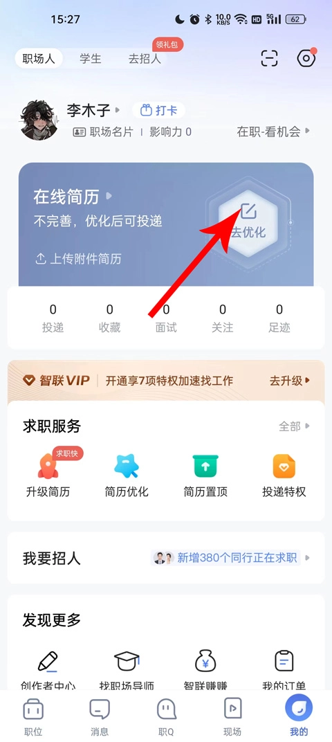 3、接下来在个人头像下方找到在线简历,点击去优化进入
