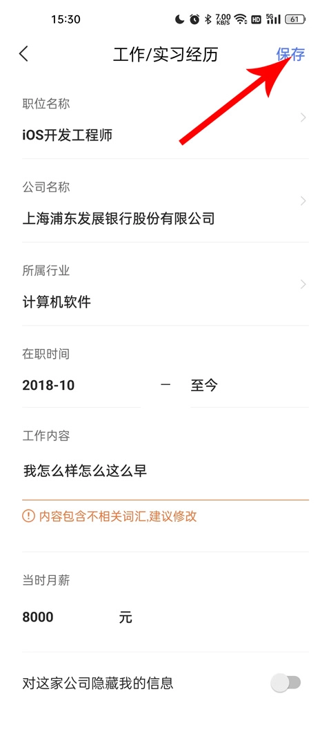 4、进入在线简历页面后,求职意向、教育经历、工作经历等模块均可直接点击编辑,填写好内容后点击右上角的保存按钮,即可完成相应操作。