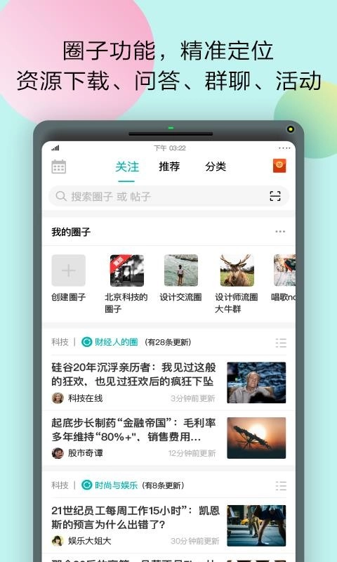 3、兴趣圈子板块,用户能够自主创建专属圈子,或是申请加入自己感兴趣的现有圈子,从而和拥有相同爱好、理念的伙伴们交流互动,分享彼此的经验与心得。
