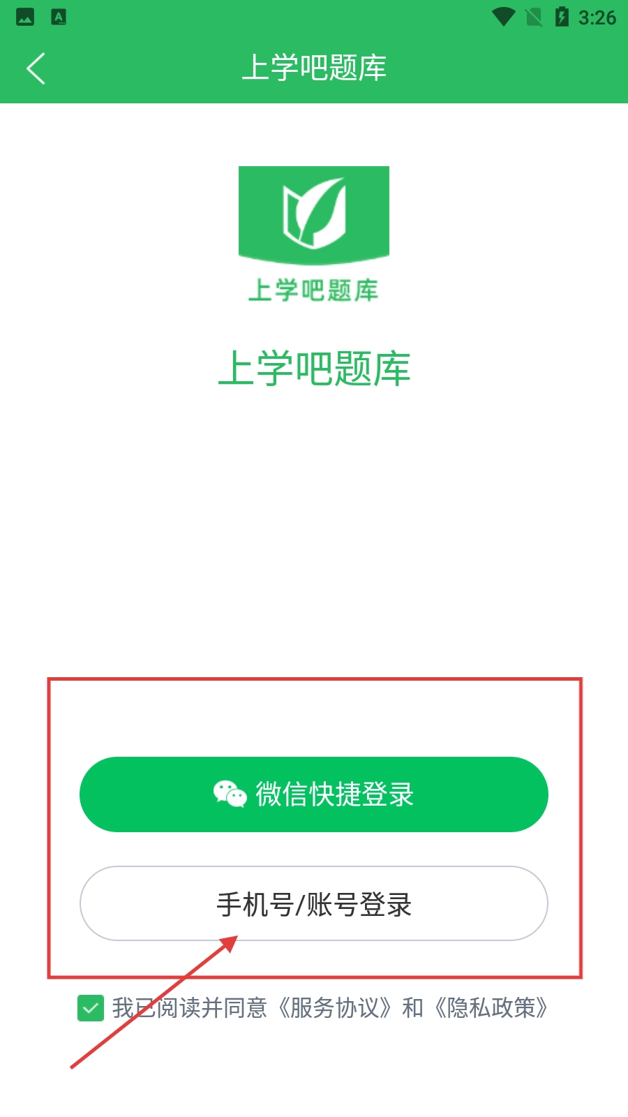 在上学吧题库的登录界面,你可以选择【微信快捷登录】或者【手机号/账号登录】这两种方式,勾选同意相关协议后就能完成登录操作。