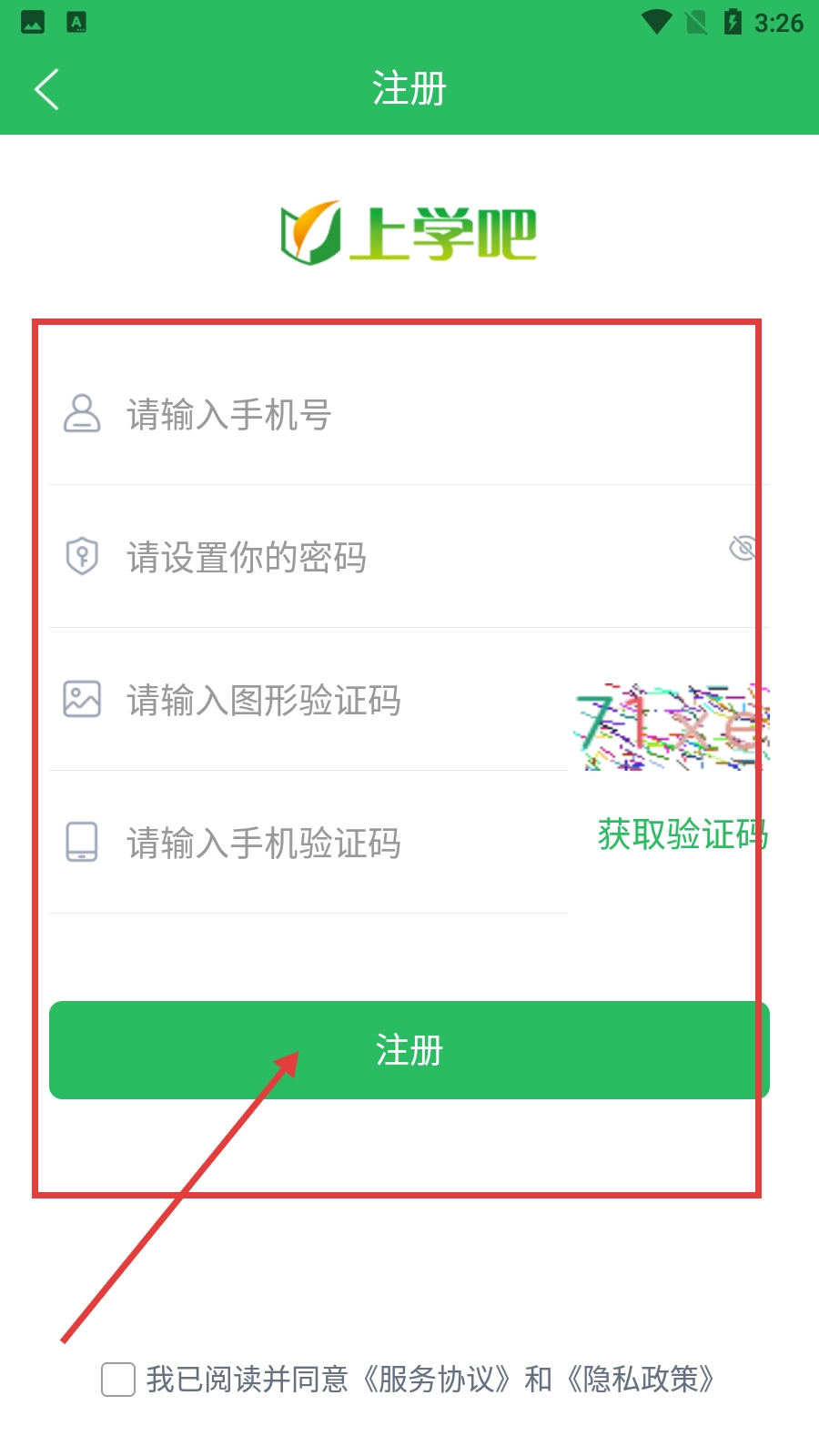 4、进行注册操作时,需按顺序填写手机号、设置登录密码、输入图形验证码以及手机验证码,在勾选同意相关协议后,点击【注册】按钮即可完成注册流程。