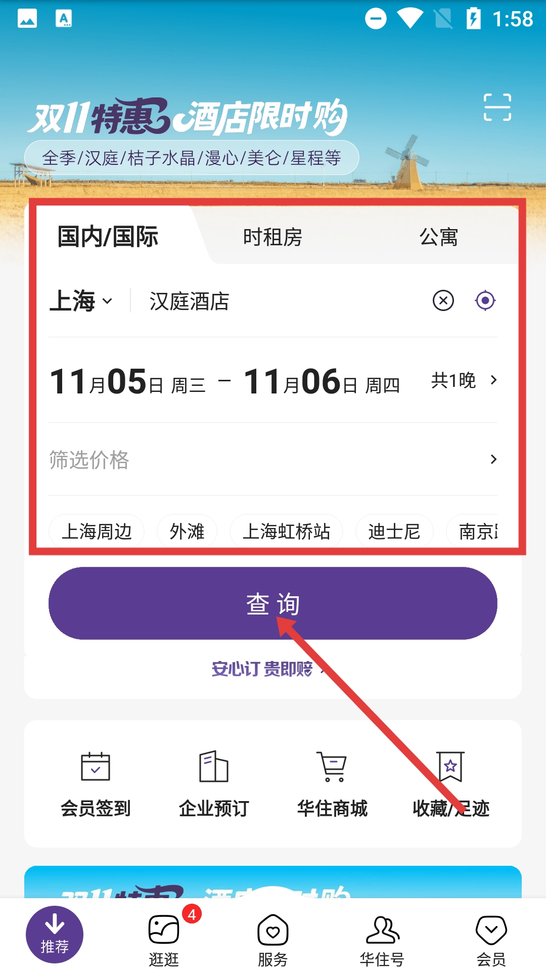 1、酒店预订:华住酒店支持用户在全国范围内在线预订汉庭酒店,用户可依据自身需求挑选适宜的房型与入住日期。