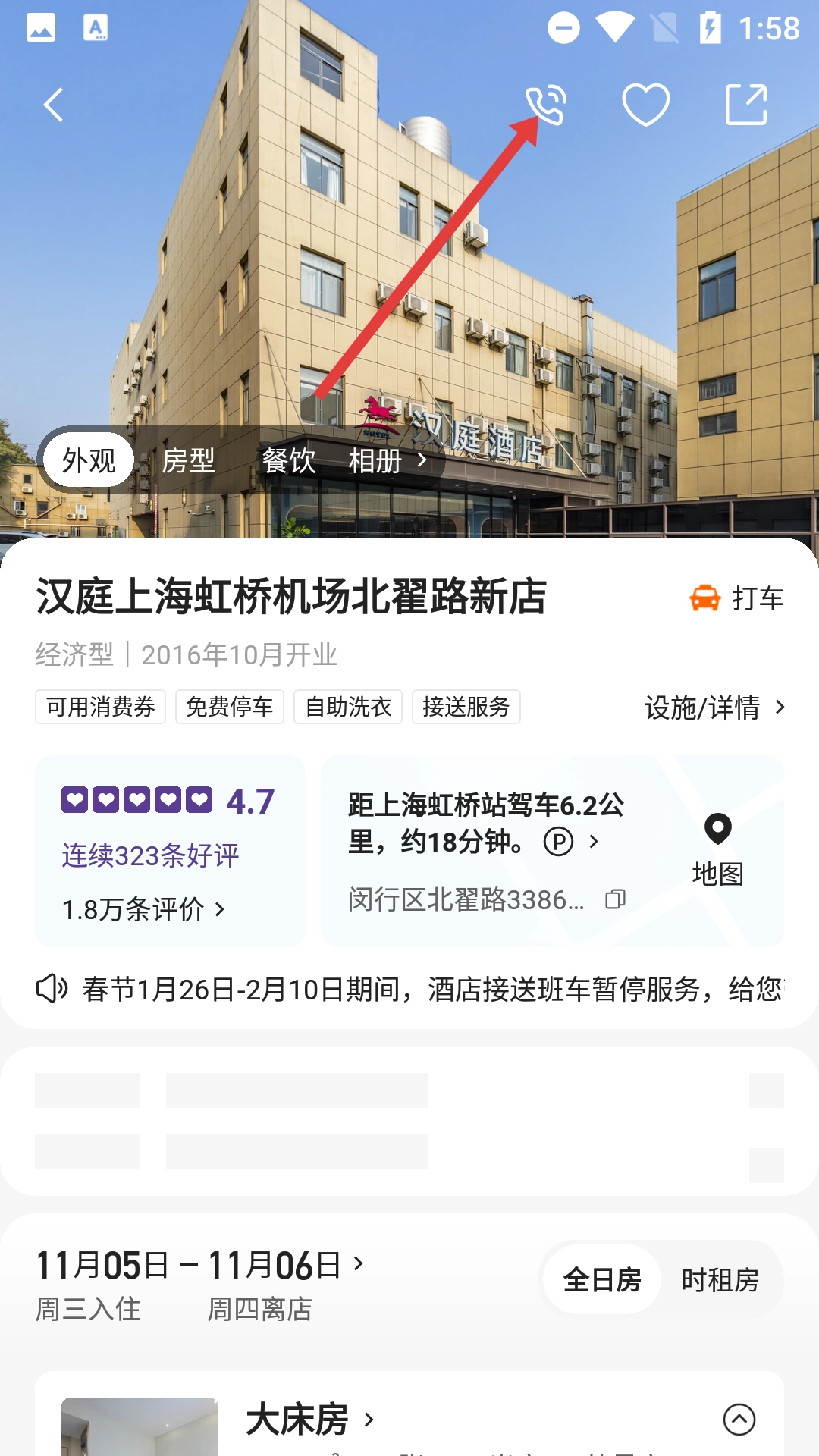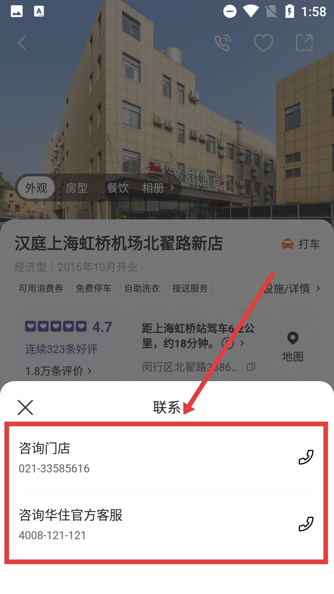 在酒店详情页面,点击顶部的电话图标,会弹出联系选项。