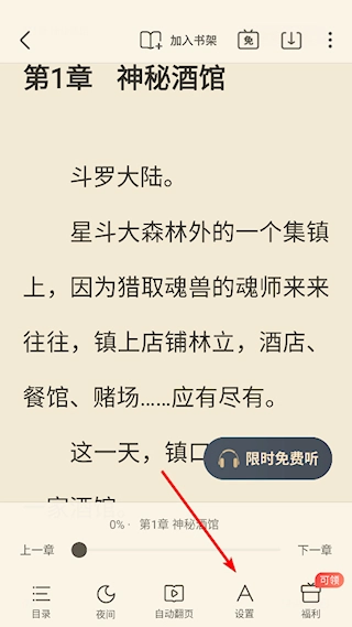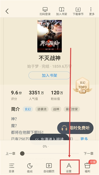 2、进入书籍详情页后,点击底部的【设置】按钮,能打开阅读设置界面,调整阅读相关参数。