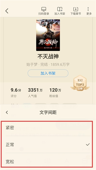 3、在阅读设置界面,点击【间距正常】选项,可进入文字间距的选择页面,调整文字的间距样式。