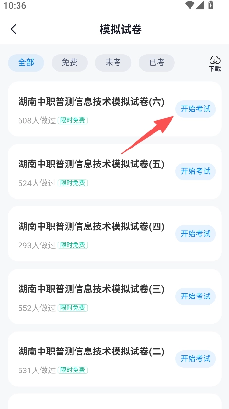 2、进入模拟试卷列表,选择试卷点击开始考试。