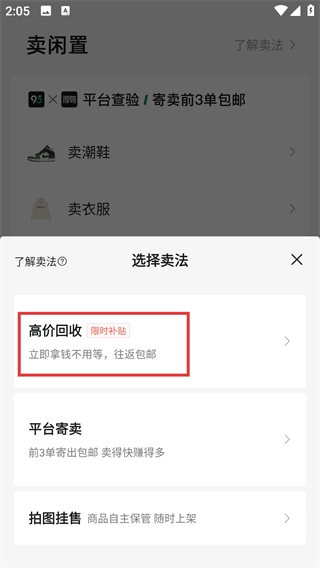 3、选定售卖品类后,系统会弹出【选择卖法】窗口,其中包含【高价回收】【平台寄卖】等选项,您可根据自身需求选择对应的卖法。