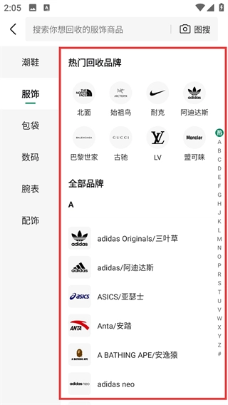 4、进入回收页面后,可在【热门回收品牌】或【全部品牌】板块中,选择待回收服饰所属的品牌,以推进回收流程。