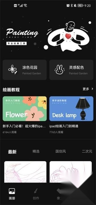 1、首先大家进入iartbook绘画应用,我先介绍一下各板块的使用方法和包含内容。在画册板块里,大家可以进行新手入门学习,还能找到最新的各类填色内容。