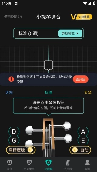 进入尤克里里调音界面后,可选择标准C调、低音G等不同调音模式,让大家的使用更具自由度。