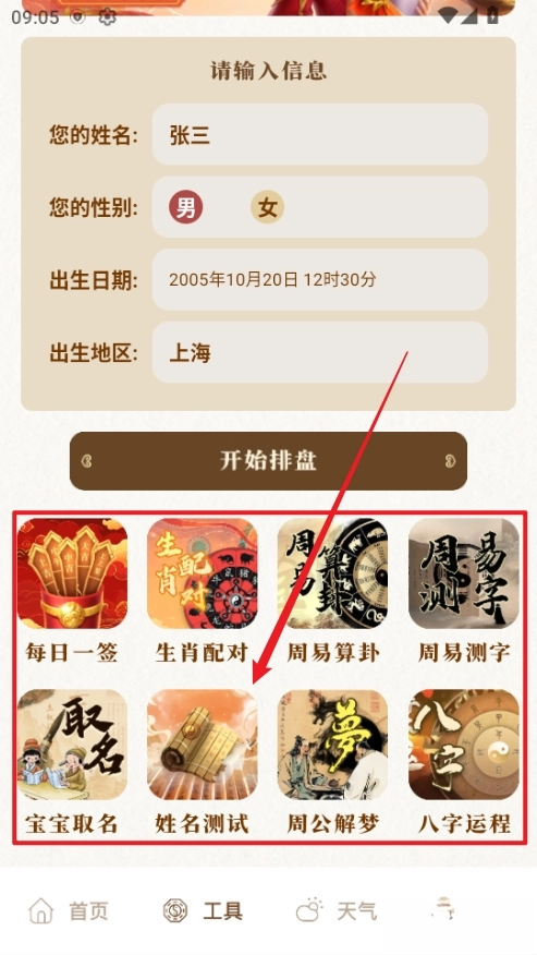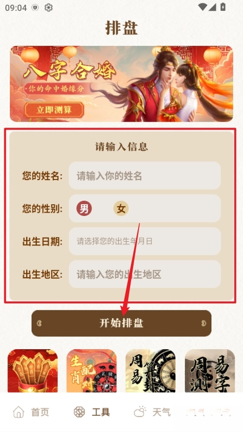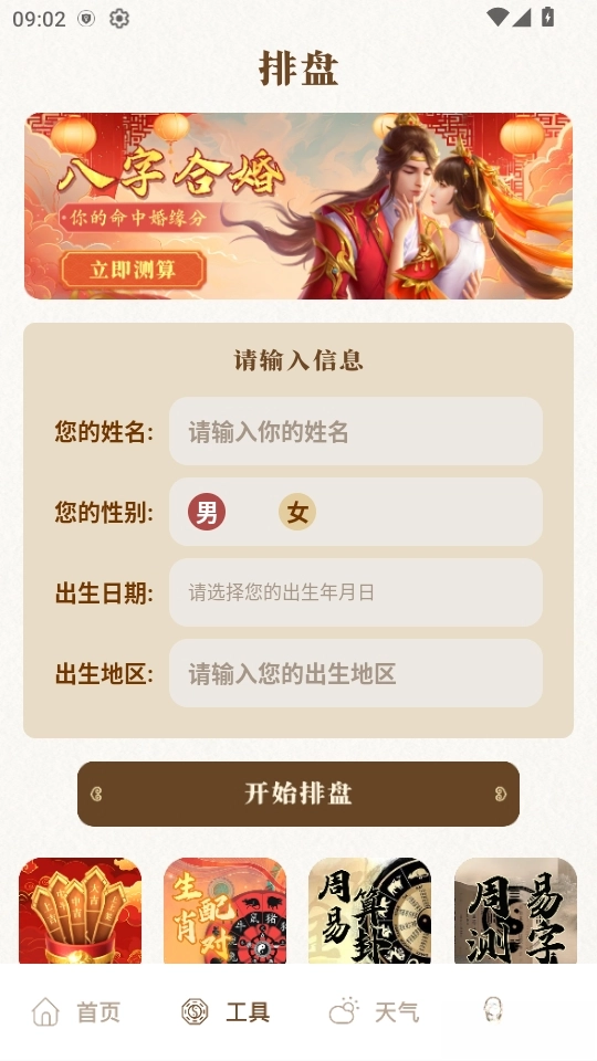 排盘工具十分全面,整合了八字排盘、八字合婚、紫微斗数等各类专业工具,涵盖情感、事业、健康等生活场景,能够满足多样化的需求。