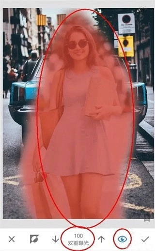 进入蒙版界面后,要留意相关参数。此刻双重曝光的数值设定为100,用画笔在图片上涂抹,被涂抹的区域就会呈现出人物。这表明,当我们以100的双重曝光数值对图片进行涂抹操作时,图片会显示出后续添加的人物图像;反过来,要是将双重曝光参数调整为0再进行涂抹,图片则会重新展现出以车辆为背景的效果。