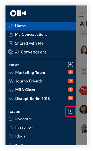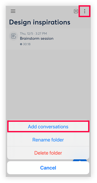 在文件夹界面,点击右上角的图标来调出“添加对话”菜单。点击该图标后,会展示出已记录的数据列表,你可以从中选择需要归类到当前文件夹的数据。