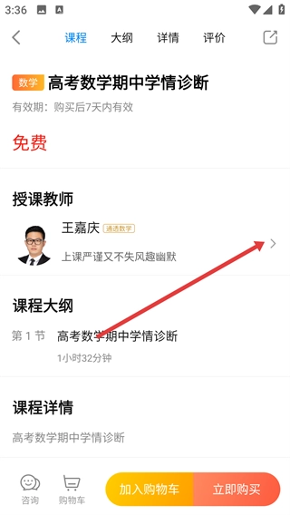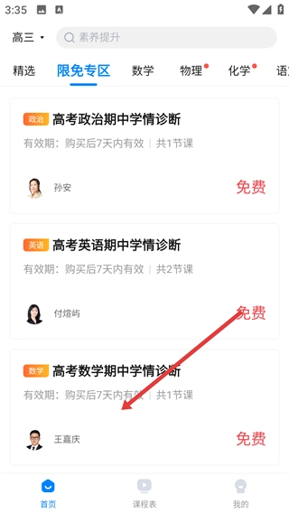 2、进入限免专区后,找到并点击【高考数学期中学情诊断】这门课程,即可进入该课程的详情页面。