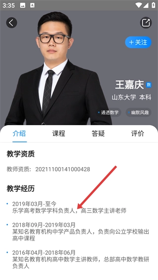 4、进入教师详情页面后,能够查看该教师的教学资质、教学经历等相关信息。