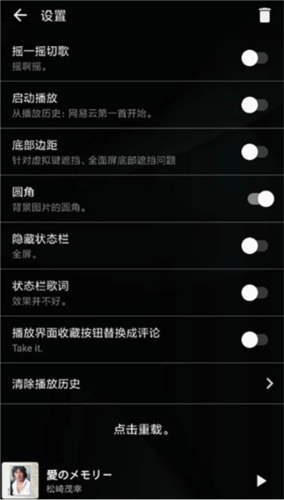 4、进入设置页面后,用户也能尝试开启“摇一摇切歌”“状态栏歌词”“底部边距”等功能,以此提升播放体验。