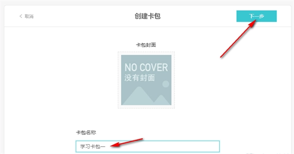 3、进入卡包页面之后,我们先在页面中输入卡包名称,然后点击右上角的“下一步”选项