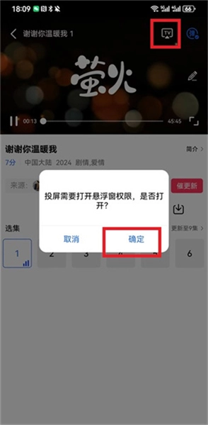 在界面里找到播放视频的区域点击,此时能看到右上角出现【tv】标识,点击该标识即可发起投屏操作;不过在此之前需要完成授权步骤,需点击【确定】按钮来为软件授予相应权限。