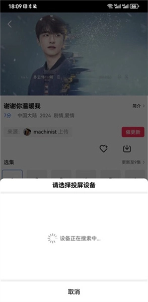 回到软件的剧集播放界面后,再次点击【tv】按钮就能开启投屏功能,待搜索到可用的投屏设备,即可完成投屏连接。