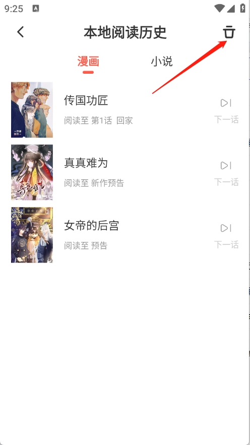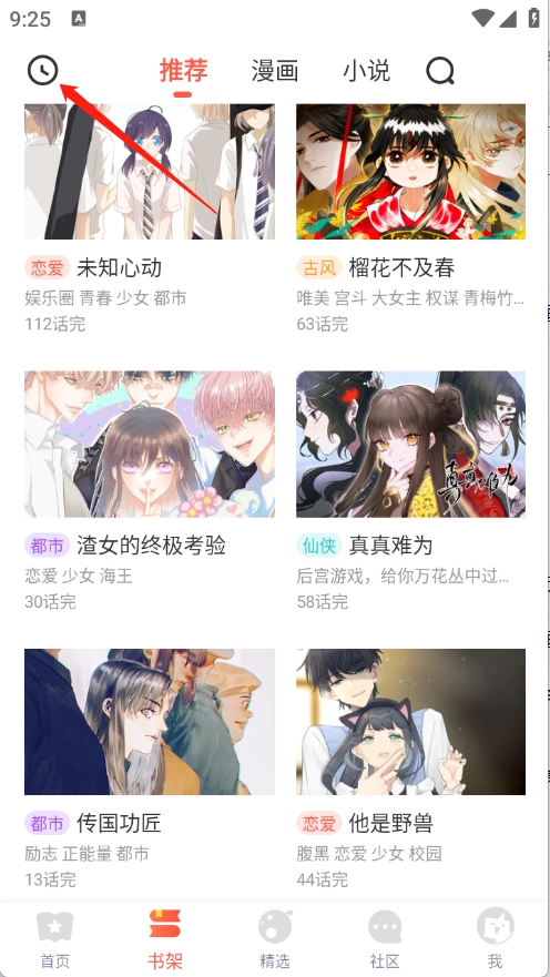 进入到书架页面,点击左上角历史。