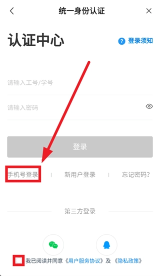 在本站安装并打开江西管职院应用,进入登录页面后,勾选“我已阅读并同意《用户服务协议》及《隐私政策》”,再点击手机号登录选项。
