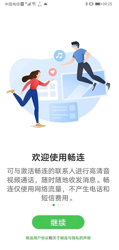 1、安装本网站后,在手机桌面找到“畅连”应用并打开。此时会出现畅连的介绍动画,直接点击“继续”按钮即可。