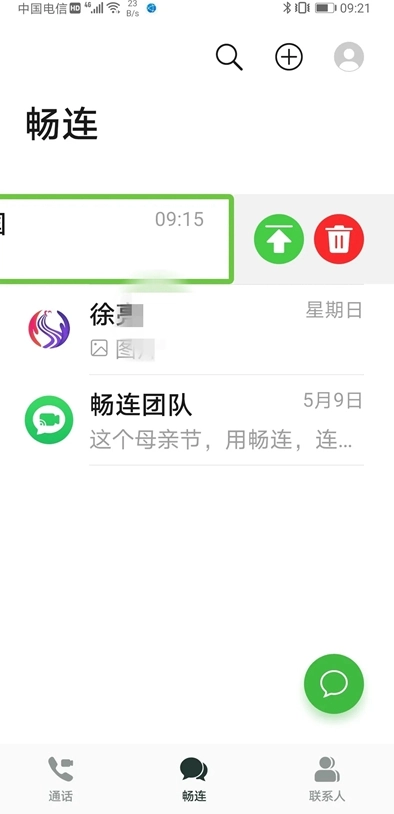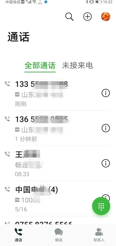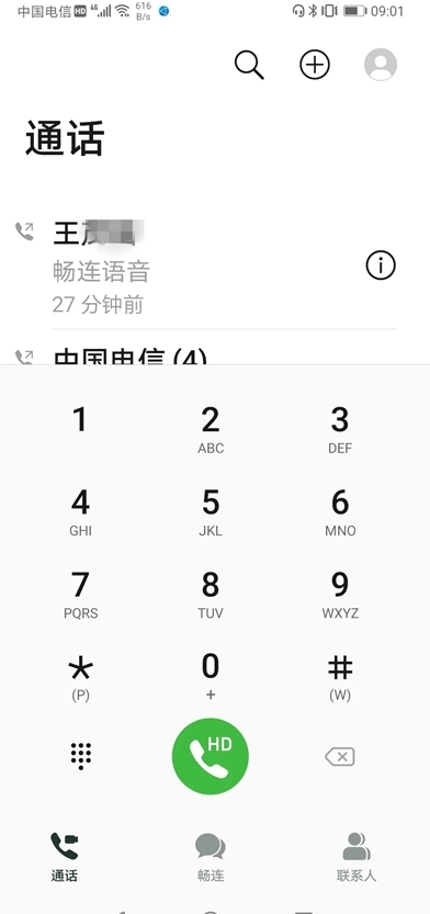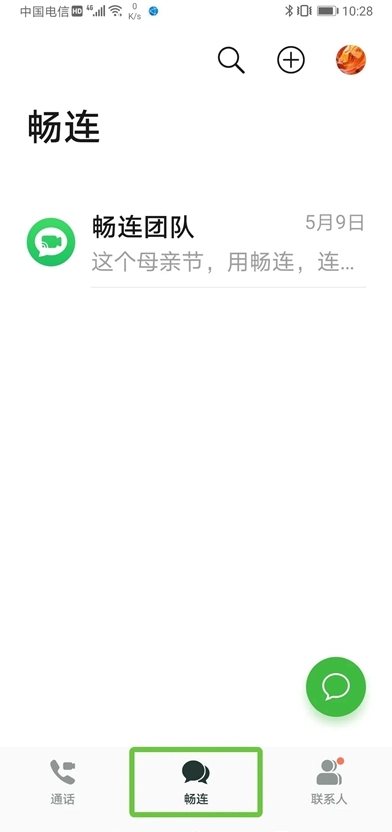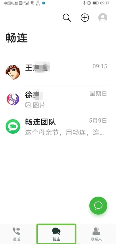屏幕下方从左往右排列着三个标签,依次是“通话”“畅连”和“联系人”,进入页面后会自动停留在“通话”标签页。