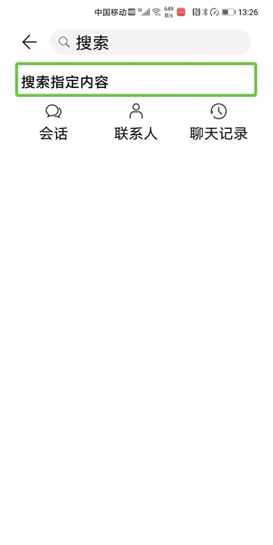 在“搜索编辑框”的下方设有“搜索指定内容”区域,其下排列着三个功能按钮,依次为“搜索会话”“搜索联系人”和“搜索聊天记录”,用户可依据自身需求选择点击相应按钮。