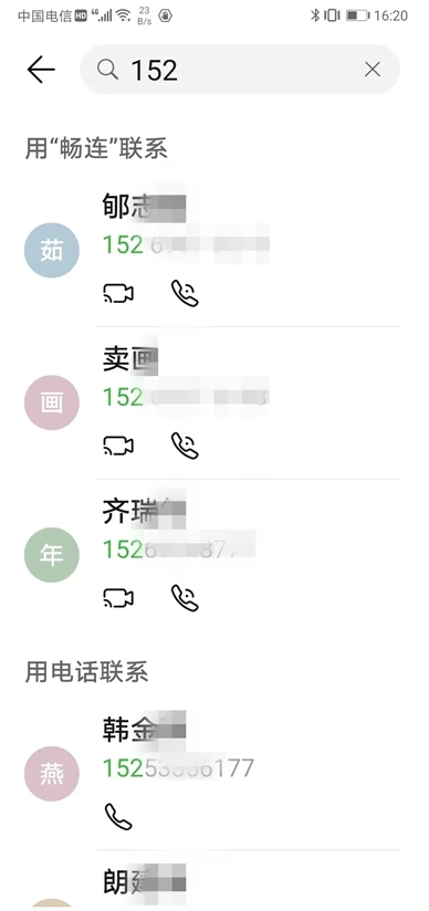在“搜索编辑框”中输入号码后,下方会呈现对应联系人的姓名。若该联系人已开通畅连功能,界面将显示“畅连视频呼叫”与“畅连语音呼叫”两个操作按钮;若未开通畅连,则仅展示“语音呼叫”按钮,提示通过电话进行联系。