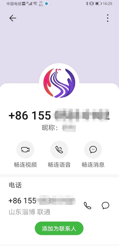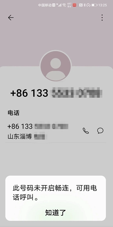 若未开通畅连,系统会提示“此号码未开启畅连,可用电话呼叫”;点击“知道了”按钮后,该号码将显示出来,号码右侧设有“呼叫”与“发信息”两个按钮,其下方还存在一个“添加为联系人”的按钮。