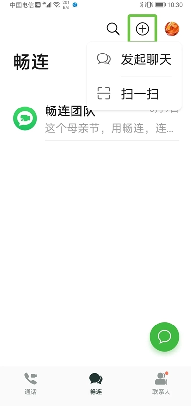 打开“畅连”应用后,屏幕顶部的最右侧排列着三个功能按钮,依次为“搜索或输入号码拨打”、“发起聊天或扫一扫”以及“设置”。