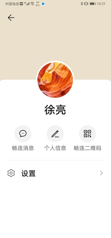 3.设置点击进入后,界面上方显示头像,头像下方是昵称,昵称下方排列着三个图标,依次为“畅连消息”“个人信息”和“畅连二维码”,这三个图标下方则是设置选项。